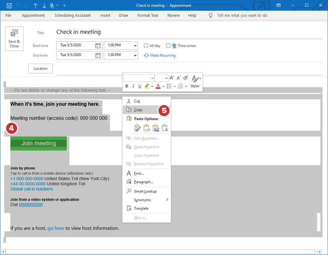 Seleccione todos los detalles de la reunión desde su aplicación de calendario o correo electrónico y seleccione copiar.