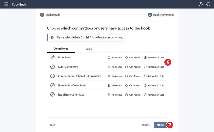 Aparecerá la pantalla Permisos del libro, con permisos de visualización para grupos de reunión y usuarios copiados del libro archivado. Puede actualizar estos permisos en el nuevo libro según sea necesario.
