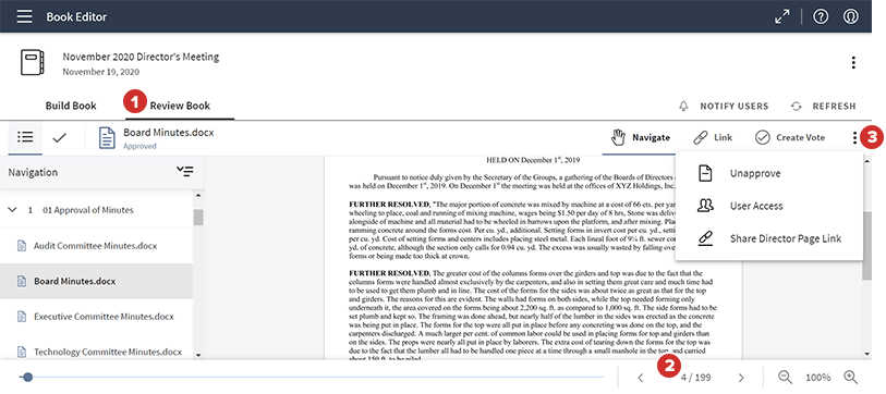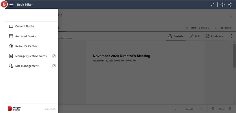 Para generar un enlace al libro, puede seleccionar el menú en la parte superior derecha de la pantalla y luego seleccionar "Compartir enlace a libro de directores".