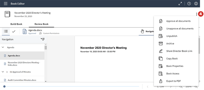 Al editar un libro, seleccione la ficha Revisar libro para ver el libro tal como lo ven los directores.