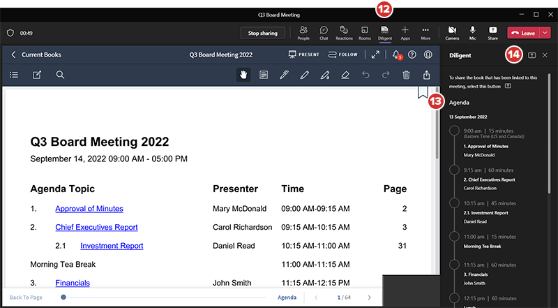 Para ver el contenido del libro y compartirlo con los participantes de la reunión, seleccione el icono de compartir en el panel de Diligent. Los usuarios que tengan acceso al libro verán su versión única en la ventana de la videoconferencia. Estos pueden navegar por el libro, crear notas y anotaciones, votar y seguir al presentador como si estuvieran usando la aplicación Diligent Boards fuera de la reunión de Microsoft Teams. Para obtener más información, consulte Usar la aplicación Diligent Boards en Microsoft Teams.