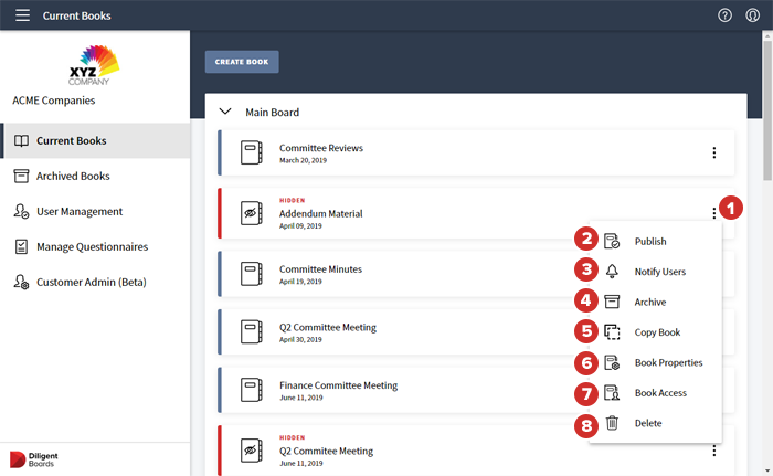 Para ver las opciones de administración de libros, seleccione el icono de menú en el extremo derecho de la fila de un libro.