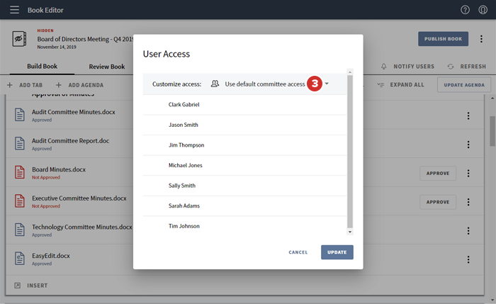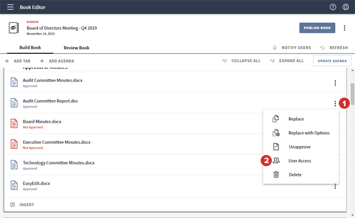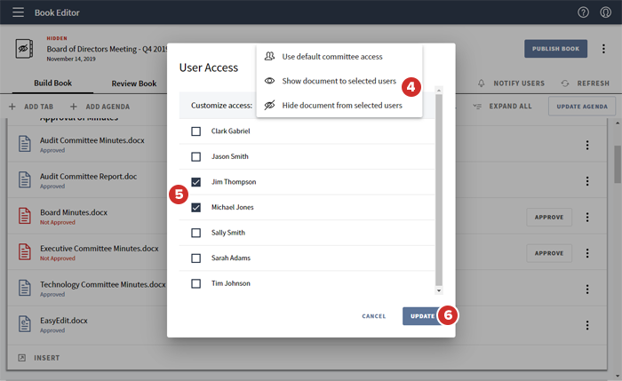 Aprenda a hacer que los documentos individuales estén ocultos o sean visibles solo para determinados miembros de la organización, lo que garantiza que los observadores correctos tengan acceso a materiales específicos cuando se publique el libro.