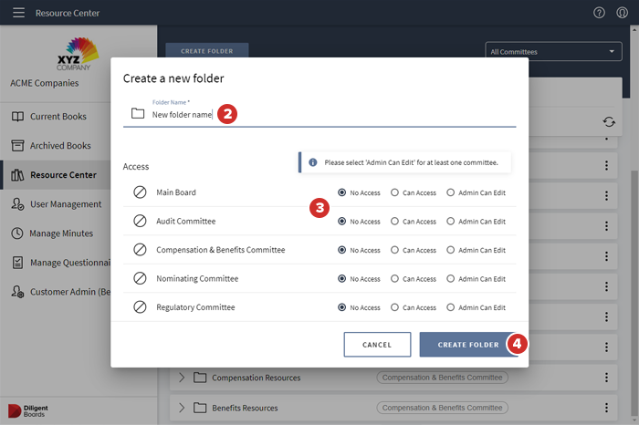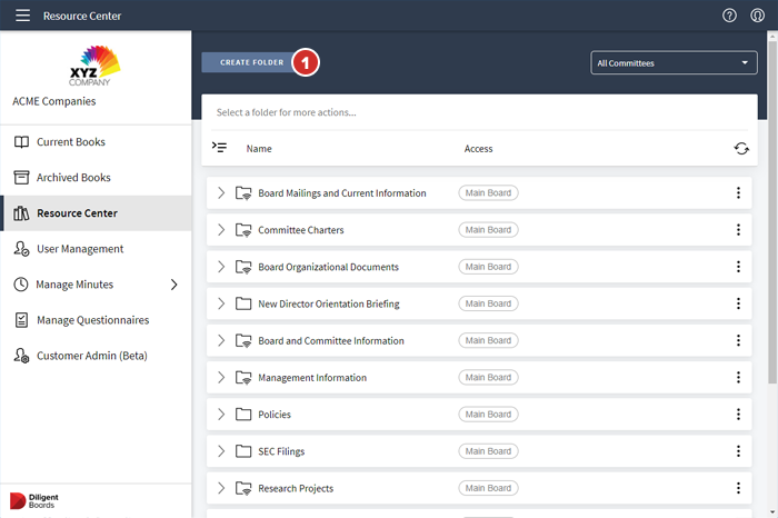 Para agregar una carpeta al final de la lista de carpetas del Centro de recursos, seleccione Crear carpeta.