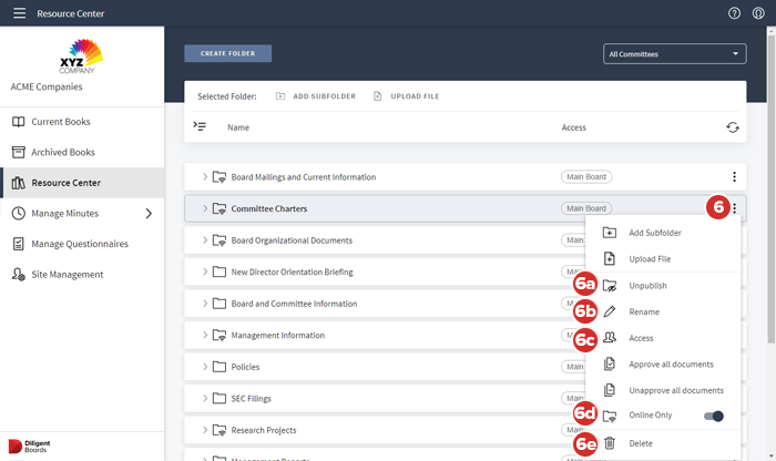 Para anular la publicación de una carpeta y ocultarla de todos los usuarios sin eliminarla, seleccione Anular publicación. Las carpetas se publican por opción predeterminada y se pueden volver a publicar seleccionando la opción "Publicar" que aparece.