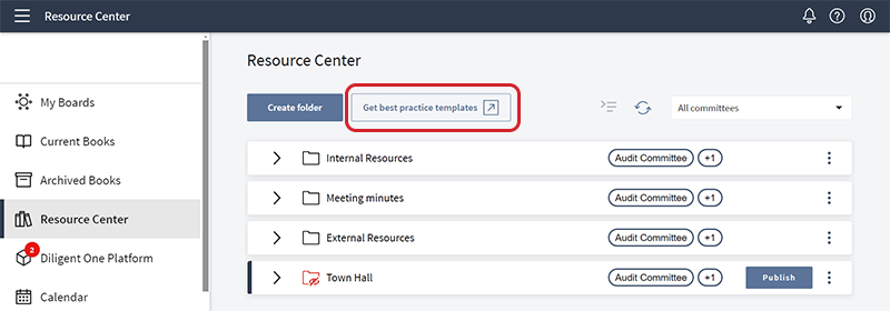 Seleccione Obtener plantillas de buenas prácticas. Será llevado a la Academia de Diligent.
