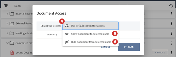 Para establecer permisos personalizados de visibilidad de documentos, seleccione el campo Personalizar acceso, que inicialmente está configurado en "Usar acceso predeterminado del comité". Si los permisos se han cambiado previamente para este documento, la opción actual aparecerá en el campo.