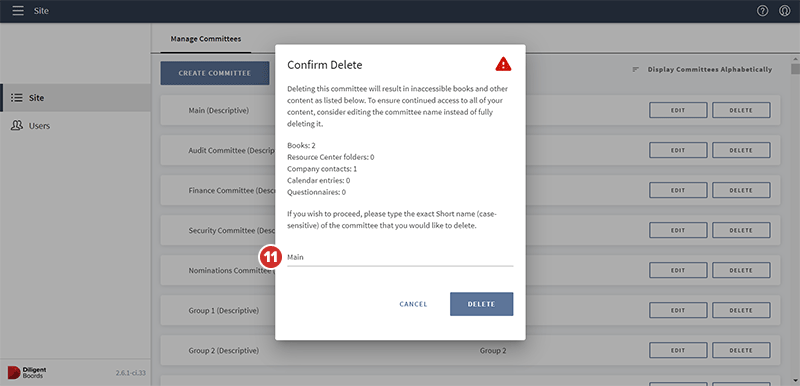 Los usuarios ya no podrán acceder a los libros, archivos o carpetas que solo estén guardados en el comité que está a punto de eliminar. Para continuar, ingrese el nombre corto del comité y luego seleccione "Eliminar".