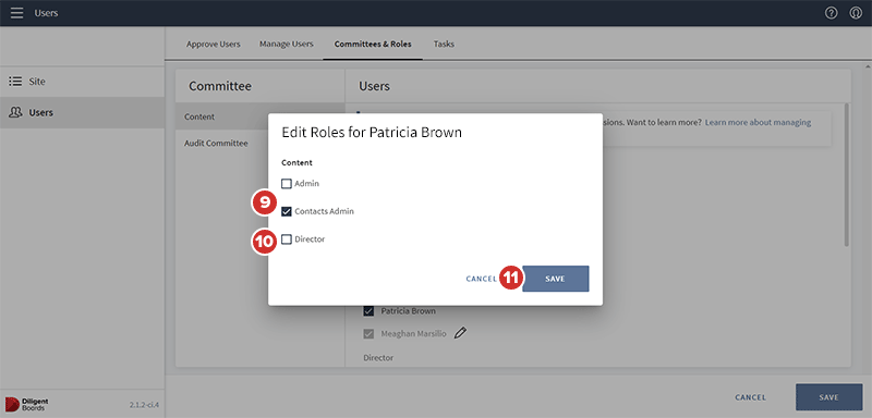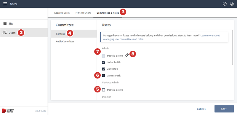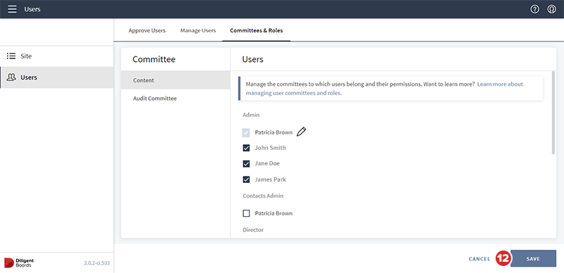 Como administrador, puede controlar a cuáles juntas directivas y comités pertenece la mayoría de los usuarios. También puede editar los roles de los usuarios en comités cruzados y roles cruzados. Este tema explica cómo administrar los comités y roles de los usuarios.