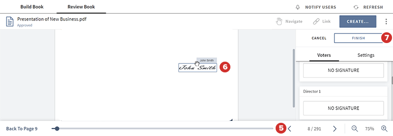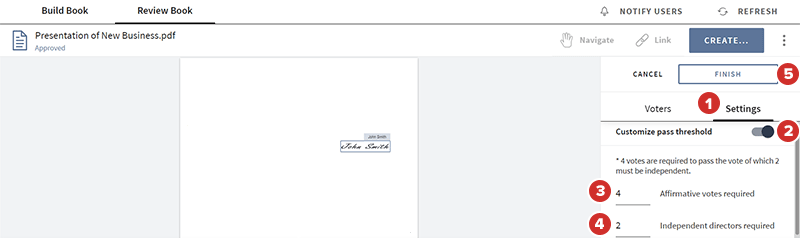 Seleccione Finalizar para guardar sus cambios y completar la votación con firma.