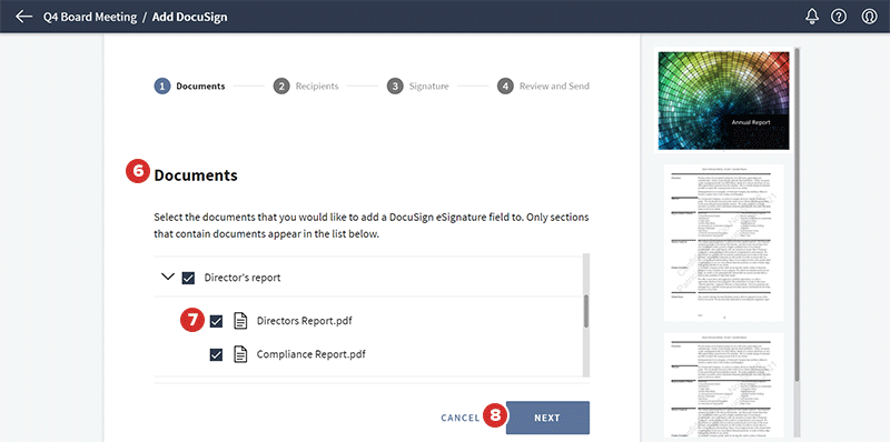 La próxima vez que seleccione un sobre DocuSign eSignature, no iniciará sesión en DocuSign. Continuará con los siguientes pasos en Diligent Boards.