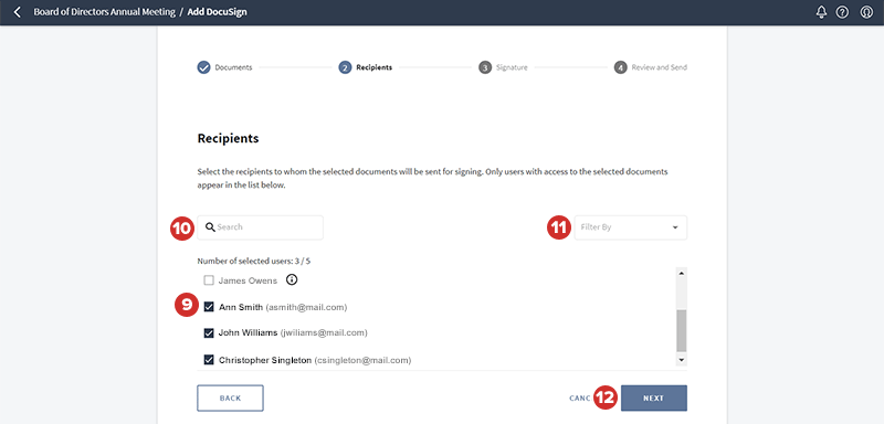 Desde la página Destinatarios, puede seleccionar a quién se enviará el sobre de firma electrónica para que lo firme. Para agregar un destinatario, seleccione la casilla de verificación que está junto a su nombre.