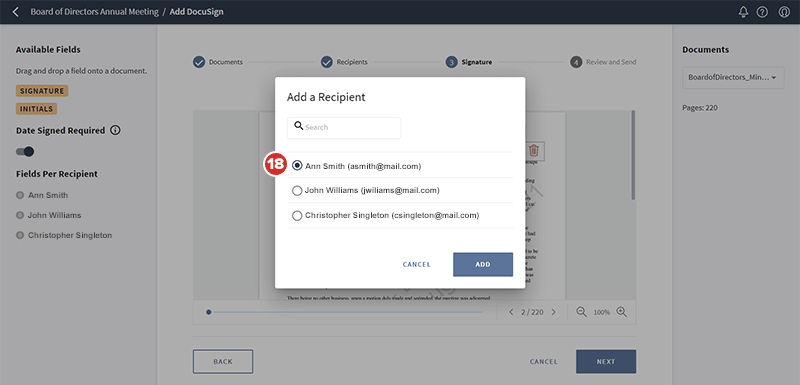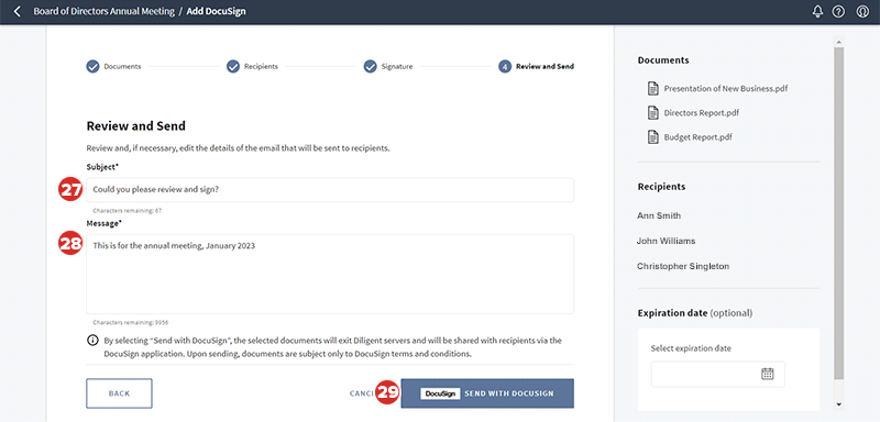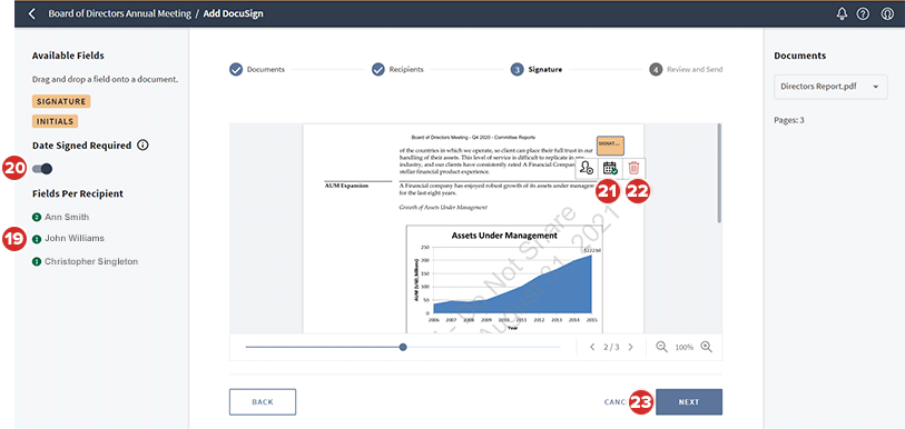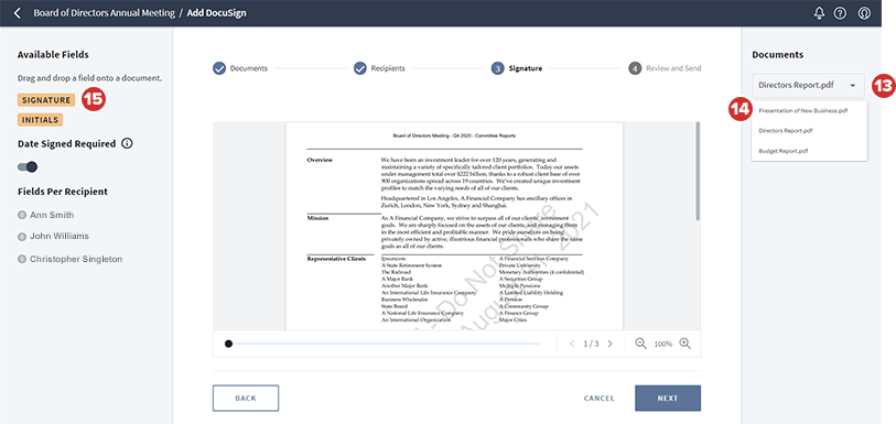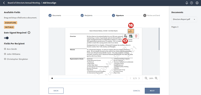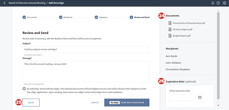 Los destinatarios solo verán los campos de firma cuando abran el documento en DocuSign. Los campos de firma no son visibles en los documentos de Diligent Boards.