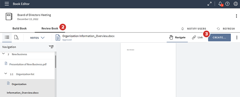 Para crear un sobre de firma electrónica, que contiene todos los elementos de la solicitud de firma, primero seleccione los documentos que se revisarán y firmarán. En la página Documentos se puede ver una lista de los documentos que agregó al libro, organizados por secciones.