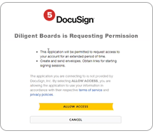 La primera vez que seleccione "DocuSign eSignature", accederá a la pantalla de inicio de sesión de DocuSign en una nueva ficha del navegador web. A continuación, deberá aprobar la aplicación Diligent Boards para acceder a la cuenta de DocuSign de su organización. Esta aprobación es necesaria para crear y enviar sobres eSignature a través de la integración de DocuSign con Diligent Boards.