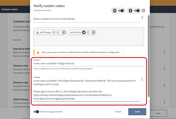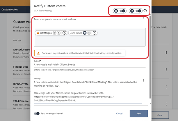 Se abre el cuadro de diálogo Notificar a los votantes. Utilice las opciones de notificación en la parte superior derecha del cuadro de diálogo para activar o desactivar los siguientes tipos de notificaciones: