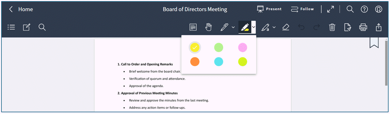 Para acceder al panel de selección de color, seleccione la flecha que apunta hacia abajo que está junto a la herramienta de resaltador a pulso. Ahora puede seleccionar un color de su preferencia. Los resaltados a pulso existentes seguirán siendo los mismos.