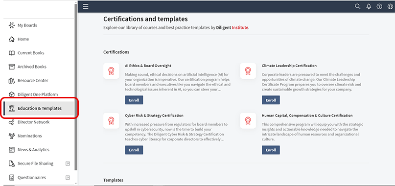 La página Certificaciones y plantillas incluye una biblioteca de cursos y plantillas de prácticas recomendadas de Diligent Institute. Este tema describe cómo acceder a los materiales y plantillas formativos.
