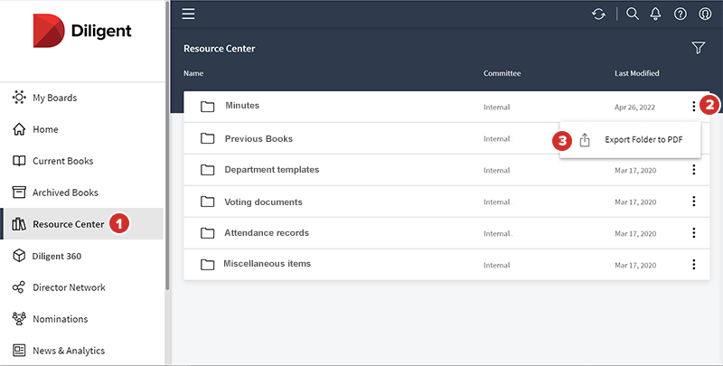 Si no se muestra la opción "Exportar carpeta a PDF", significa que no se ha habilitado la exportación para usted o para su sitio. Comuníquese con su ejecutivo de cuentas para obtener ayuda.