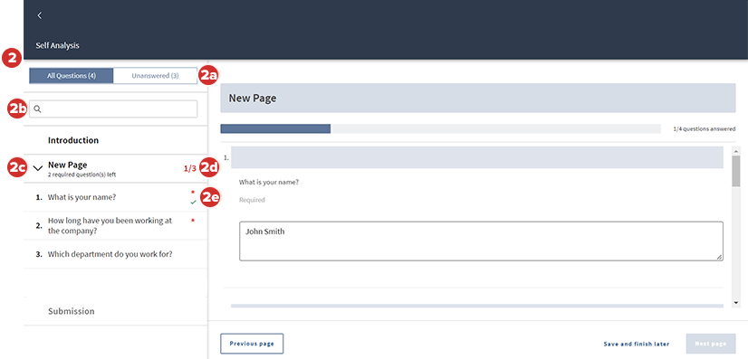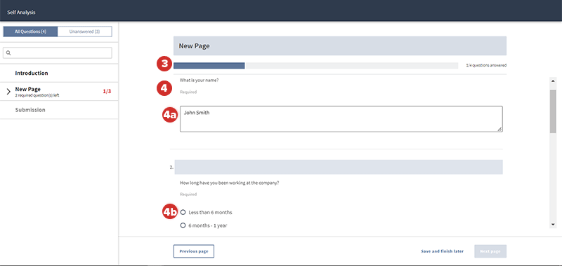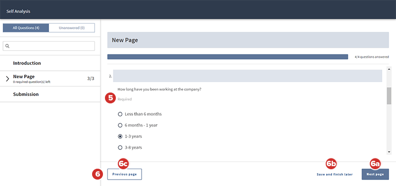 La cantidad de preguntas obligatorias que hay en cada página se muestra en rojo. Una vez que haya respondido todas las preguntas obligatorias, el color cambiará a gris.