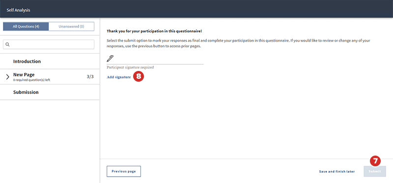 Algunos cuestionarios pueden requerir que coloque una firma digital en la última página antes de enviar sus respuestas. Para hacerlo, seleccione Agregar firma antes de seleccionar Enviar.