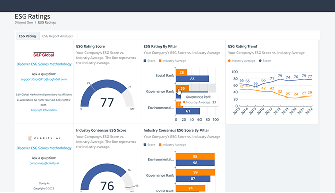 Diligent recopila datos sobre ESG de una variedad de socios honorables y confiables, como Standard and Poors (S&P) Global y ClarityAI. Estos socios y sus datos de terceros proporcionan una visión amplia de los cargos en el área de ESG, y la plataforma de Diligent One crea ideas y visualizaciones contextualizadas para los directores en Boards. Utilice el informe Calificaciones ESG para ver puntos de datos en tiempo real directamente de proveedores externos y evaluar el rendimiento y los riesgos de ESG de su organización en general en comparación con el promedio de la industria.