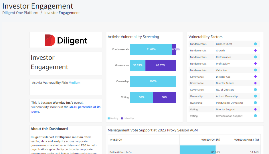 Con la plataforma Diligent One, el informe sobre la participación de los inversionistas utiliza datos de Diligent Market Intelligence (DMI) para ayudar a las empresas que cotizan en bolsa a comprender rápidamente su riesgo de activismo de los accionistas y de voto disidente en comparación con sus homólogas derivadas de DMI. Además, el informe destaca cómo se compara la remuneración de los directores ejecutivos con la de sus homólogos revelada a partir de las declaraciones de representación. Para más información sobre la metodología del informe, visite Metodología del Informe sobre el Compromiso de los inversionistas.