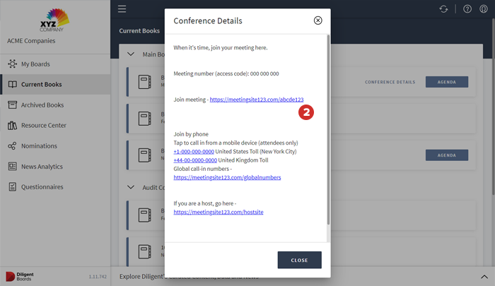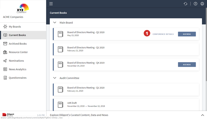En la pantalla Libros actuales, seleccione el botón Detalles de la conferencia para el libro de reuniones del cual desea ver información. Este icono aparecerá cuando el administrador haya agregado información de la conferencia a los detalles del libro.