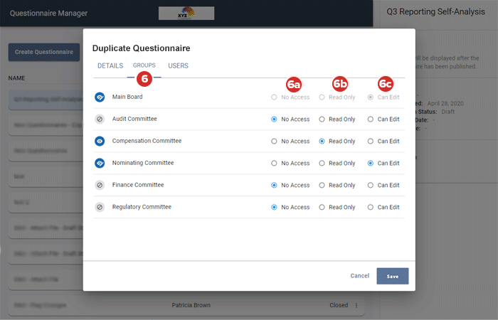 Pour modifier l’accès au questionnaire au niveau du comité, sélectionnez l’onglet Groupes. Les autorisations du questionnaire d’origine seront dupliquées ici. Pour modifier les paramètres d’accès des groupes, procédez comme indiqué ci-dessous :