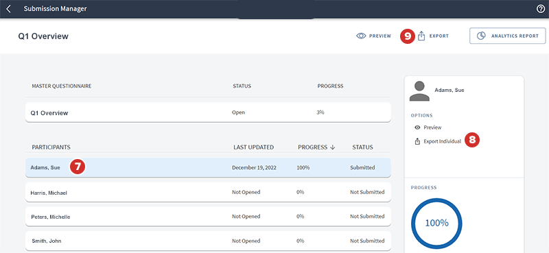 Pour exporter les réponses de plusieurs participants, sélectionnez l’option Exporter en haut de l’écran.