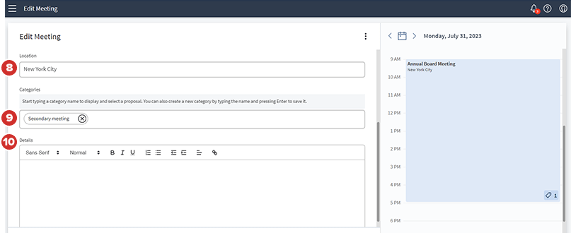 Per assegnare una categoria alla riunione, inserire del testo nel campo Categorie, quindi selezionare un nome di categoria dall'elenco visualizzato.