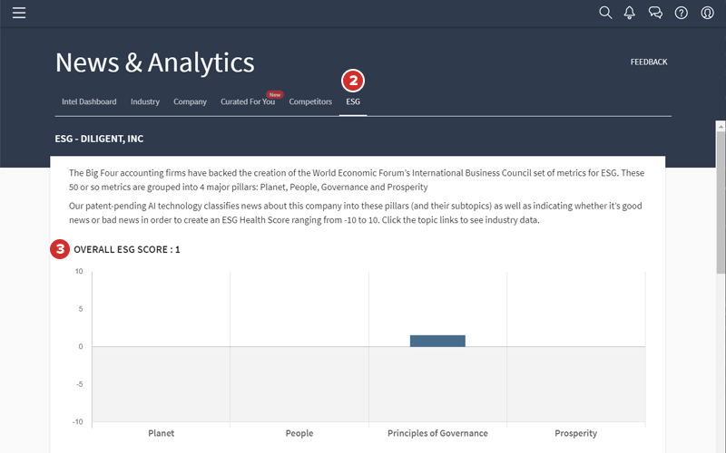 U kunt met behulp van de tools op het tabblad ESG van de hub Nieuws en analyses voor Web de mediastatus van het bedrijf bekijken in belangrijke ESG-gebieden.