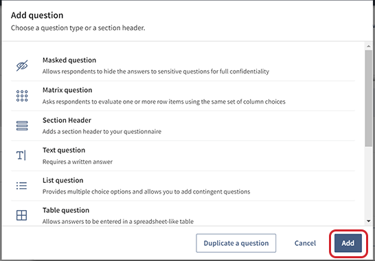 Selecteer Toevoegen. De vraag wordt toegevoegd aan de vragenlijst.