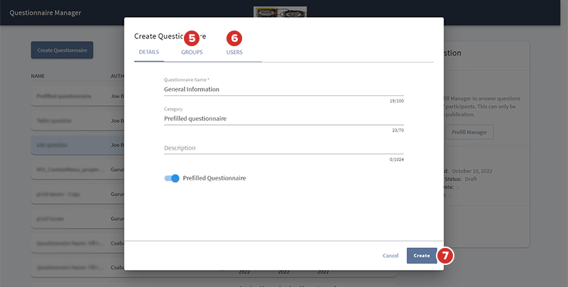 Selecteer Maken. Het Vragenlijstdashboard wordt geopend. Zodra u vragen hebt toegevoegd, opent u Beheer bij vooraf invullen om te beginnen met het beantwoorden van vragen namens deelnemers.