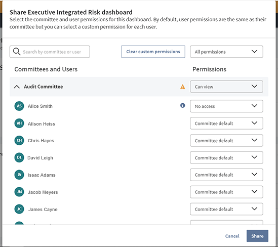 U kunt machtigingen instellen voor gebruikers en commissies voor toegang tot aangepaste rapporten. In dit onderwerp wordt uitgelegd hoe u machtigingen beheert. Voor meer informatie over het Diligent One-platform raadpleegt u het Overzicht van Diligent One.