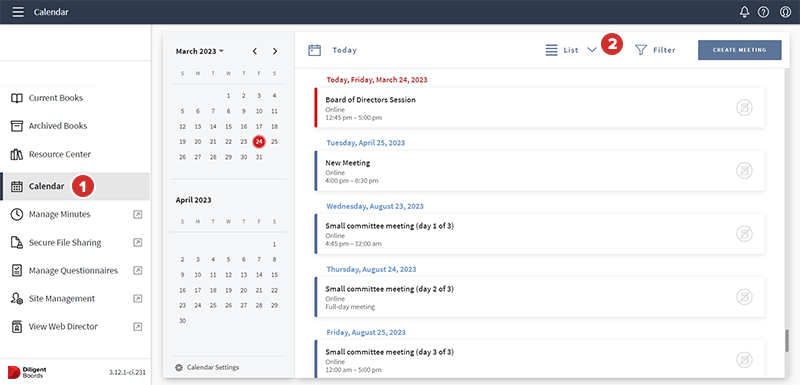 Er wordt een scherm met uw bestuursvergaderingen weergegeven. Om de weergave te wijzigen, selecteert u het vervolgkeuzemenu Lijst bovenaan het scherm en kiest u een van de volgende opties: