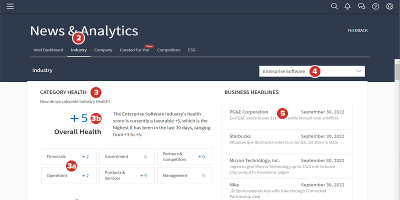 在类别健康部分,各个类别的健康状况分数基于与您所在行业相关的每个类别找到的正面、负面和中立新闻专题的数量。