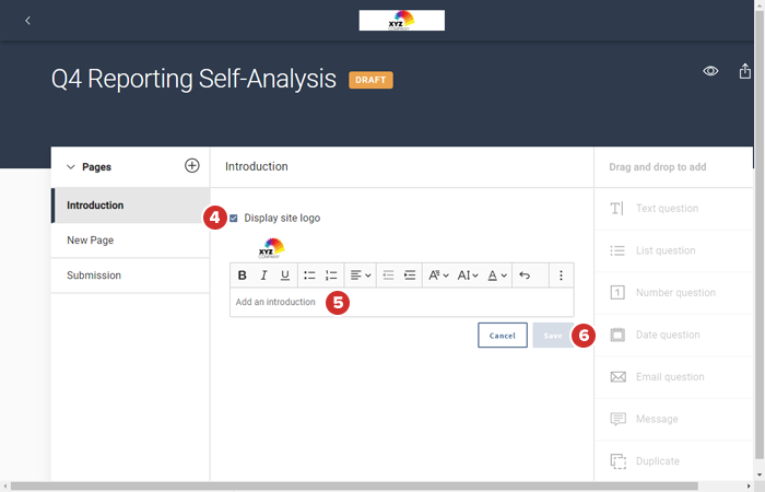 简介页面是封面,您可在此显示公司徽标和有关调查问卷的具体说明。该功能默认已启用。