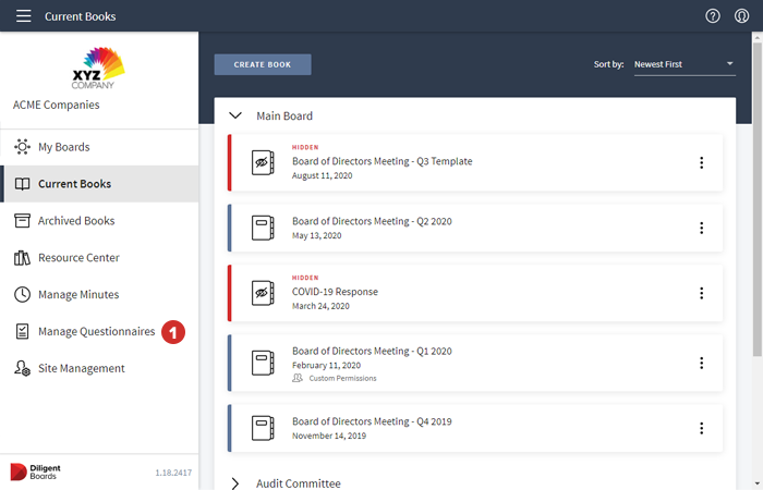 要将调查问卷添加到您的 Diligent Boards 站点,请从左侧导航菜单中选择管理调查问卷。