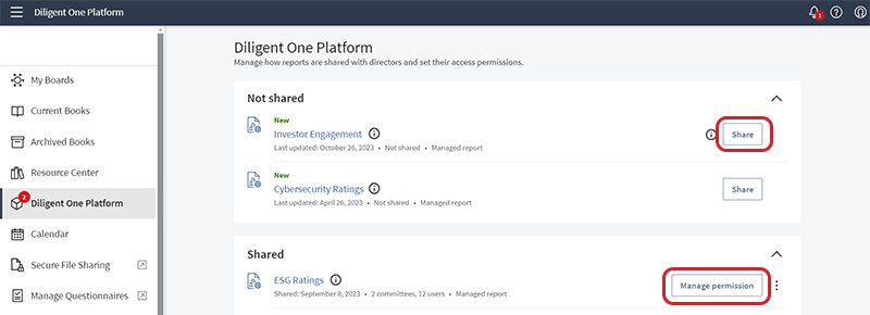 要共享报告,请选择共享。然后,您将为委员会和用户设置访问权限。有关更多信息,请转到设置 Diligent One 报告的权限。