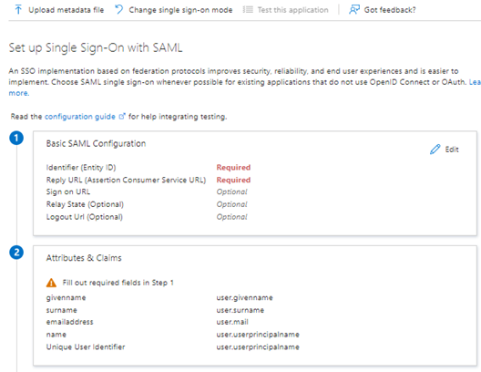 Boards 的登录方法为 SAML 2.0。选择“基本 SAML 配置”部分中的铅笔图标,以编辑 SAML 配置数据。
