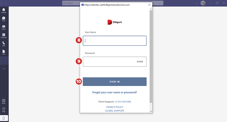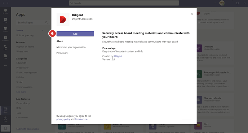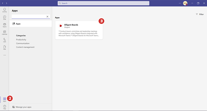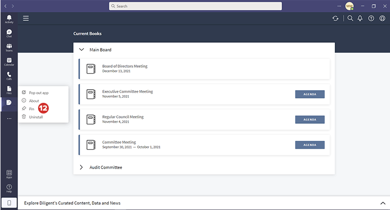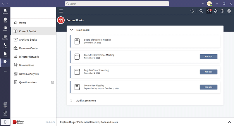 登录 Boards Web Director 后,您可以在 Microsoft Teams 中打开 Diligent Boards 应用程序,在会议之前、期间和之后阅读董事会书籍和委员会材料,并使用各个中心内的功能。要了解更多信息,请参阅在 Microsoft Teams 中使用 Boards 应用程序。