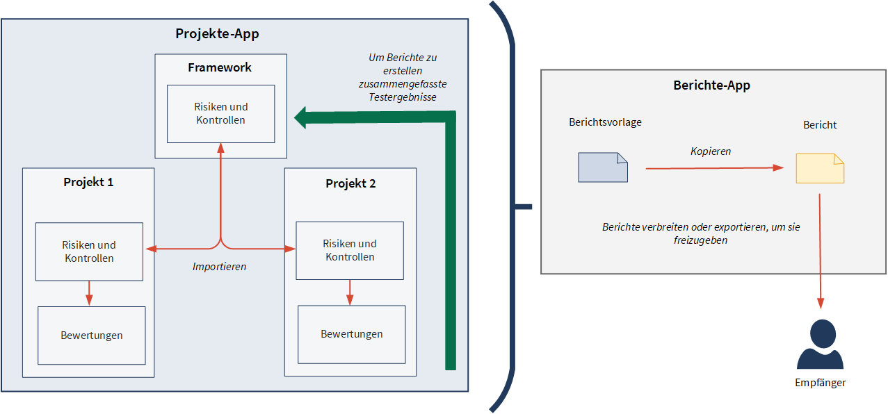 Innerhalb eines Frameworks können Sie die Absicherung und die Testergebnisse im Zusammenhang mit operativen Risiken und Kontrollen überwachen, um ein Dashboard der Risiko- und Projektergebnisse zu entwickeln. Während Sie Kontrollen testen, fasst die Projekte-App in Echtzeit die Testergebnisse aus den Projekten, die mit dem Framework verbunden sind, automatisch zusammen und berechnet die Absicherung. An jedem Punkt können Sie Berichte generieren, die an die entsprechenden Empfänger gesendet werden.
