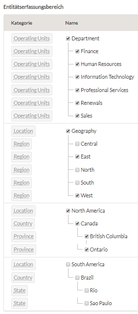 Unter Entitäten verwalten modellieren Sie die Geschäftsstruktur auf Grundlage der Abteilungen, Regionen und Standorte, die für beide Projekte gelten: