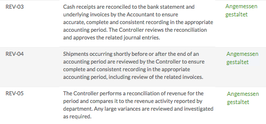 - REV-03 Zahlungseingänge werden vom Buchhalter mit den Bankbelegen und den zugrunde liegenden Rechnungen abgeglichen, um genaue, vollständige und einheitliche Buchungen in der entsprechenden Buchhaltungsperiode sicherzustellen. Der Controller prüft den Abgleich und genehmigt die entsprechenden Journaleinträge.