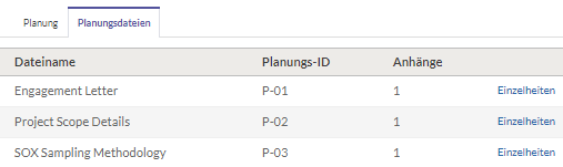 Jedes Projekt beginnt mit einer Planungsphase. Die Planung eines Projekts umfasst die Vorbereitung und Konsolidierung der Planungsinformationen in einem Projekt. Dazu gehören Projekthintergrund, Zweck, Umfang und die relevanten Planungsdateien. Planungsdateien können eine Vielzahl von verschiedenen Dokumenten umfassen, wie z.B. Informationen zum Projektrahmen, Auftragsbestätigungen, Dokumentation zur SOX-Stichprobenmethodik und sogar Details über die Strukturen der Projektteams.