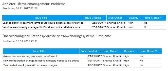 Sie haben zwei Berichte, die detaillierte Problemdaten enthalten, die mit zwei Projekten verbunden sind: