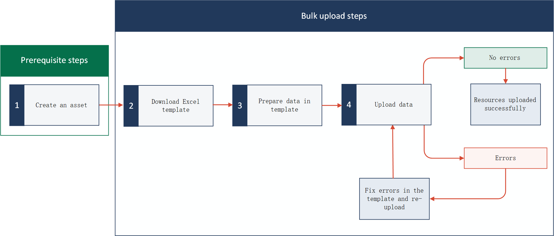 You open a new Bulk Importer session and download the Excel template from the Bulk Importer page in the Platform home. You prepare data in the template and then you upload the template in the Bulk Importer page.
