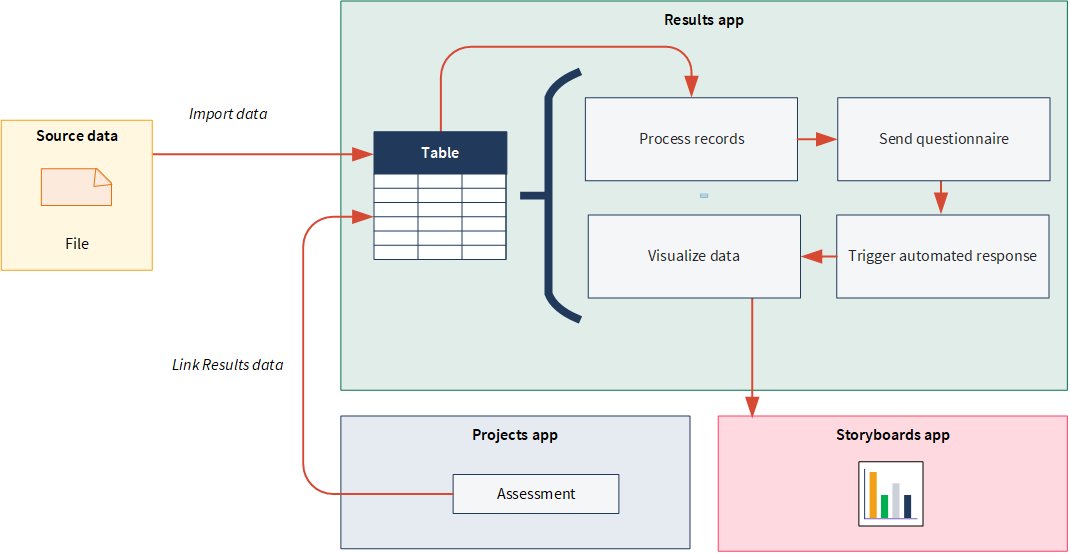 - Storyboards present data results using multiple visualizations, which is based on record data in Tables.