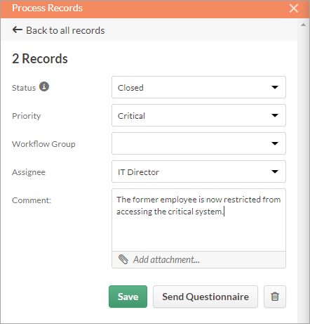 The IT Director performs the necessary work to restrict the individuals from access to the critical systems. After the work is complete, the IT Director adds a comment to the records to confirm that remediation measures have been taken, and closes the records by updating the status field.